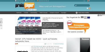 Preisjäger.de ist eine Webseite, die einen Blog für Schnäppchen und Gutscheine beinhaltet. In diesem Blog sind Angebote verschiedenster Kategorien zu finden, darunter Technik, Unterhaltung, Mode & Beauty, Urlaub & Freizeit sowie Sonstiges. Neben diesen Produktthemen kann der Nutzer zudem zwischen Angeboten aus Deutschland, Österreich oder Europa wählen. Die derzeitigen Top-Schnäppchen werden auffällig auf der Startseite dargestellt.
